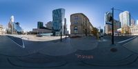 Aerial view of the intersection of 6th Ave and 21st Street in downtown Toronto. Modern architecture dominates the cityscape, with high-rise buildings and mixed-use complexes. Clear sky and open spaces create a vibrant urban design.