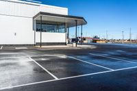 This stock photo features a parking lot located in Toronto, Ontario, Canada. The parking lot is completely coated with concrete and black asphalt, creating a smooth surface. The image showcases a clear sky overhead, indicating that it is a sunny day. The parking lot is surrounded by various shopping establishments, including storefronts and shops. This photo is perfect for illustrating urban environments, transportation, and commercial areas in Toronto, Ontario, Canada.