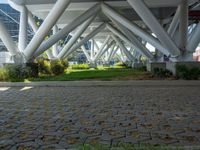 This stock photo depicts a concrete walkway with white pillars in a row, surrounded by green grass. The photo is taken in Taipei, Taiwan, situated in Asia. The clear blue sky adds to the city's urban landscape. The walkway resembles an alley-way, leading to a base station or charging station for electric vehicles. This urban design incorporates a paver surface, providing a smooth road for pedestrians and drivers. The photo captures the essence of Taipei, a bustling city in the Republic of China, also known as Taiwan.