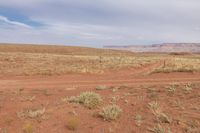 This stock photo showcases the stunning natural environment of the Land of the West in Utah, USA. The image features a dirt road traversing a desert landscape, with red rock formations and vegetation in the background. The scenic view highlights the rugged beauty of the canyonlands region. The grass surface alongside the road adds a touch of greenery to the otherwise arid terrain. The cloudy sky and gloomy atmosphere create a dramatic and captivating scene. Perfect for showcasing nature, off-road adventures, and the allure of the American West.