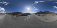 the view of a highway from below a 360 - lens lens in which there is a person on a skateboard