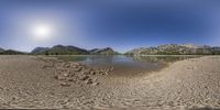 a panorama view of the beach from the water, with mountains in the distance, and blue skies and sun