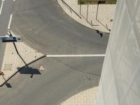 Aerial view of a busy street intersection in Berlin, Germany. Modern architecture lines the elevated road, casting intriguing shadows. Cars can be seen driving along the asphalt and concrete. A top-down perspective captures the essence of this high-rise city.