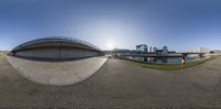 this is a fish eye lens photo taken of a bridge that goes to a parking space