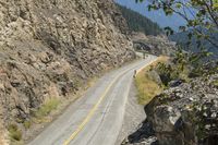 a motorcycle rider rides down a mountain road next to rocky cliffs and trees as seen from a distance