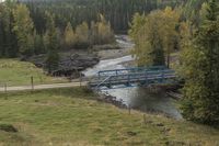 An aerial view of a river flowing through the Canadian landscape. The river cuts through vegetation-covered banks, with a bridge in the distance. The elevated and hilly terrain adds to the natural beauty of Alberta.