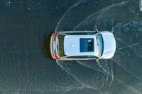An overhead view of a car driving through the waves on a beach in front of a car in California, USA. The car is following a road along the river in a suburban area. The photo was taken during the day from a high position, providing a top-down view of the water and the wet open space around it. The elevated perspective showcases the residential suburb and the beautiful scenery of the surrounding area.