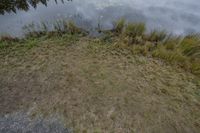 the view from above shows grass and grass and weeds next to a body of water