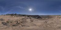 Aerial view of a desert road in Utah, surrounded by red rock formations and sparse vegetation. The sun sets over a hill, casting a warm glow on the landscape. Open space and clear skies create a serene and elevated atmosphere.