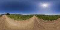 Aerial view of three small sections of dirt road in Nimmitabel, New South Wales. Sun shines brightly behind the elevated landscape, revealing lush green fields and clear skies. A picturesque rural scene in Australia.