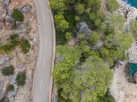 the view of a car on a road over a forested area with water and rocks