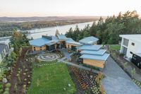 an aerial view of two houses and a large lake, in the distance is a hillside with