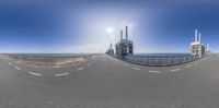 this fish eye lens is made up of an industrial area on the street and a man riding a skateboard