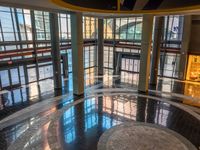 This image captures the vibrant city life of Las Vegas, USA. The modern architecture of the shopping mall is showcased with its sleek design and large windows. People can be seen walking around the lobby with its marble floors, creating a busy and urban atmosphere. The aerial perspective provides a top-down view, highlighting the city's open spaces and urban design. This photo represents the elevated position of Las Vegas, capturing the energy and architecture of the city. Experience the excitement of Las Vegas from a high point of view.