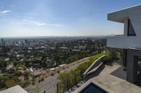 This stock photo showcases a stunning aerial view of the Los Angeles skyline and a luxurious pool. The photo was taken from an upstairs floor level home, allowing for a clear view through large windows and railings. The cityscape is beautifully framed against a clear sky, with skyscrapers towering over the city. The modern architecture of the surrounding condominiums and villas adds to the urban design of the residential area. The elevated location provides an overview of the city, capturing the bustling city life and suburban neighborhoods. The image also highlights the residential properties and real estate opportunities in this vibrant city. The road and asphalt surface below add to the overall composition of the photo, creating a visually appealing image with a mix of natural and man-made elements.