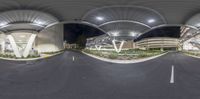 two sides of a road, with an airport building in the background and multiple streets