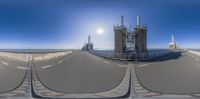 Aerial view of a modern architecture bridge in Holland, with clear skies and a calm ocean below. The sun casts a hard shadow on the road surface, creating a symmetrical and serene landscape. The perfect spot for leisure and urban design.