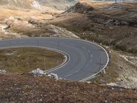This is an aerial view image of an asphalt road winding through the highland mountains of Austria in Europe. The landscape features lush green grass and open spaces, with a clear sky overhead. The road curves and meanders along the high slopes of the mountain range, offering a breathtaking view of the surrounding nature. This picturesque thoroughfare showcases the beauty of the Austrian mountains and their elevated terrain. It is a perfect representation of the stunning landscapes found in Europe's highlands.