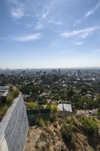 An aerial view of the modern architecture and skyline of Los Angeles, California. The clear sky contrasts with the rugged terrain and suburban residential areas. The cityscape overlooks the Armco barrier and tree-lined roads.