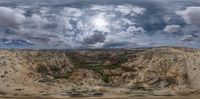 an artistic photo of a valley at sunset with the clouds overhead in a panoramic shot