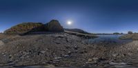 fisheye lens, taken above the beach of a rocky shoreline with rocks and water