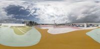 this skateboard park has skateboard ramps in it and a cloudy sky in the background