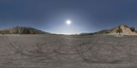 the road is empty in this view from above the mountains, and there is a sun in the sky