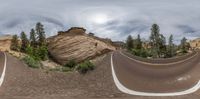 An aerial view of a straight road leading to Zion National Park in Utah. The road stretches through the majestic landscape, with mountains in the foreground. Clear skies create a stunning backdrop for this high position perspective.