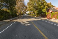 Aerial view of a suburban residential area in Kelowna, British Columbia. Straight down the road, lined with classic architecture houses. The asphalt road surface leads to the beautiful Okanagan Valley in autumn.