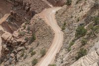 Aerial view of a winding mountain side road in Utah's Canyonlands. The rugged red rock landscape forms a dramatic backdrop for the jeep traveling on the Shafer Trail. A scenic day in the desert.