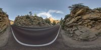 a long winding mountain road in the middle of nowhere in america, shot using 360 - angle lens