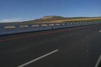 This image showcases an endless road in the desert landscape of South Africa. The asphalt road stretches out into the distance, disappearing into the clear blue sky on the horizon. The mountainous terrain and plains can be seen in the background. The road surface is smooth and the motion blur effect gives a sense of speed and movement. Alongside the road, there is a guard rail and Armco barrier for safety. This photo captures the endless beauty and vastness of the African landscape.