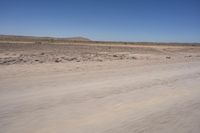 This stock photo features a stunning desert landscape in South Africa. The image showcases a dirt road that disappears into the horizon, surrounded by vast plains of sandy terrain, scattered rocks, and sparse vegetation. The clear sky above adds to the sense of endlessness, reflecting tints and shades of beige and brown throughout the scene. The image captures the natural environment and unique Aeolian Landforms found in this region, including singing sand and steppe formations. It is a perfect representation of the geology and plateau of the area known as Makhtesh. The motion blur of a vehicle tire on the road surface conveys a sense of movement and adventure, inviting viewers to explore this captivating part of Africa.