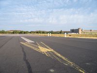 An airplane is soaring through the clear blue sky, above an empty runway that appears to be painted with yellow chalk. The spacious asphalt road stretches out below, contrasting with the surrounding grassy landscape. This urban scene takes place in Berlin, Germany, showcasing the city's modern urban design. The image captures the feeling of freedom and open space as the plane traverses the sky, leaving behind the bustling city life of Berlin.