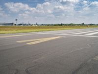 A clear sky day in Berlin, Germany. An airplane can be seen taxiing down the street from an airport runway, creating a scenic view of the landscape. The road surface made of asphalt blends into the surrounding open space of grassy fields and plain land lots. Trees and a distant horizon add to the natural beauty of the area. The image captures a recreational area near an airport, giving a glimpse of the busy airfield in Europe. This photograph was taken at Tempelhof.