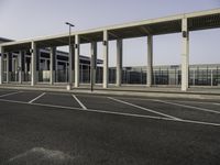 A view of an airport terminal from across the parking lot. The roof is almost closed, creating a shaded area. The asphalt road surface leads to the office building with rectangular facades. Street lights illuminate the area.