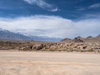 Explore the rugged dirt roads of Alabama Hills, California, under a clear sky. This desert landscape combines gravel tracks and sand streets, set against striking mountain profiles. Experience an off-road adventure in the USA's California.