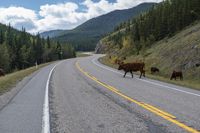 A picturesque landscape in Alberta, Canada. The asphalt road winds through the mountainous terrain, surrounded by lush forests and vibrant vegetation. The clear sky and fluffy clouds complete this breathtaking day in nature.