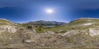 an alpine landscape is shown with rocks in the foreground and sun over water below