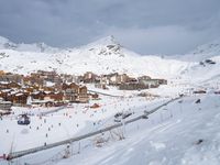 A breathtaking winter landscape in the Alps of France. Snow-covered mountains overlook a picturesque valley. The clear blue sky and open space create a stunning view. A popular tourist attraction for skiing and winter tourism in Europe.