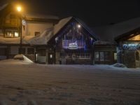 A picturesque view of a snow-covered road at night in a residential area in the Alps. The light from the buildings and restaurants illuminate the winter landscape. A popular tourist attraction in France, Europe.