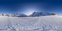 A breathtaking view of snow-covered mountains in the French Alps. Skiers in a group enjoy the clear skies and sunshine on top of a slope at a resort. The perfect winter day in the European highlands.