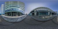 two fisheye photos showing one building and the other, with a car parked in front