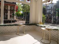 This image showcases a window with a small window seat that overlooks the city plaza area in Amsterdam, Netherlands. The window provides a view of the lively city life and the classic architecture of the buildings. The interior design of the window seat includes patio furniture made of glass. The urban design of the surrounding area features road surfaces, curbs, and storefronts of various shops and restaurants. This photo represents the vibrant city atmosphere and the European charm of Amsterdam.