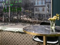 Amsterdam Window View: Restaurant, Bikes, and City