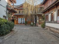 A view of an old town in Lijiang, China, with cobblestone roads lined with historic architecture. The clear sky highlights the classic architecture of the residential buildings. A peaceful suburban neighborhood in Asia.