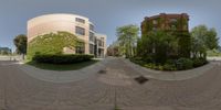 A classic apartment building in Toronto, Ontario. The clear sky reflects off the concrete street. A solitary tree stands in the foreground, adding a touch of nature to the urban landscape.