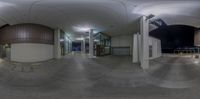 a big round picture in the center of a building with several lights and stairs going to different buildings