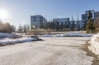 A picturesque winter day in Ontario's residential area. The clear blue sky shines on the city's architecture and concrete streets. Trees stand tall against the freezing temperatures. The sun casts a beautiful glow on the waterfront.