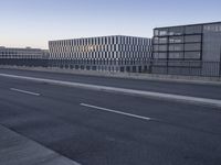 This is an image of a modern architecture road in Berlin, Germany. The city is in the early dawn, with the sun just breaking over the horizon. The clear sky contrasts with the buildings and infrastructure of the city. The road, lined with fences and lanes, is in shadow. The photo represents the urban landscape of Berlin and showcases the modern architecture and infrastructure of the city. This image captures the mix of old and new that Berlin is known for.